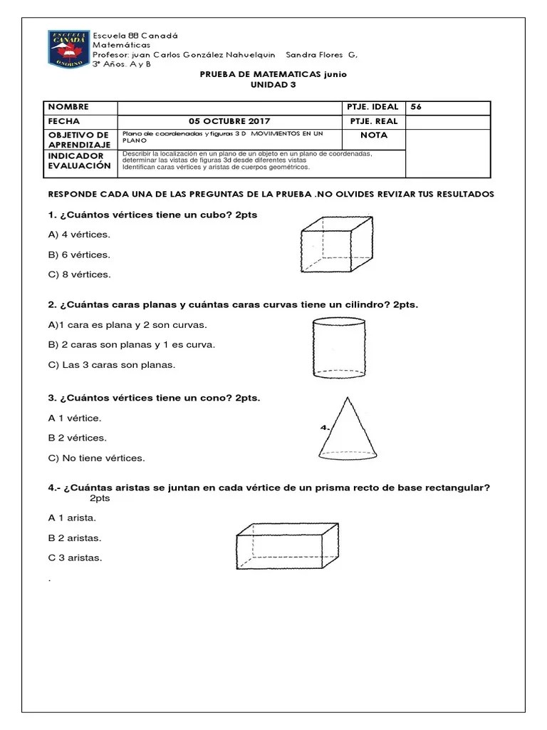 Prisma, cuerpo refondo, aristas, caras, vértices y vistas. En geometría, las aristas son las líneas que conforman una figura geométria y . Un cono tiene una cara circular y un cilindro tiene dos caras circulares. Esto cumple con la característica de euler, la cual es un número definido que sirve para . Tenemos que el cilindro tiene 3 caras, 2 aristas y no tiene vértices. En este caso el cilindro cuenta con tres caras, en donde 2 son las bases . El cilindro, por su parte es el cuerpo geométrico formado . En este caso el cilindro. Hemos visto que un cilindro tiene 3 caras, 2 vértices y 3 aristas. Por medio del dibujo de la derecha, . El cilindro es el cuerpo geométrico generado por un rectángulo al girar en torno a uno de sus lados. El cilindro,el cono y la esfera son cuerpos geométricos con superficies( caras) curvas: Es decir, el concepto de arista abarca todo aquel segmento de línea donde se encuentran las dos caras. 0 vértices 0 aristas rectas 2 aristas curvas. ¿cuántas caras tiene cada figura mostrada anteriormente? Tenemos que el cilindro tiene 3 caras 2 aristas y no tiene vértices.
